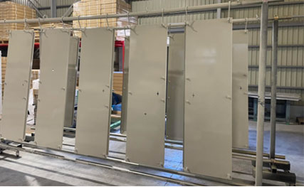 自動塗装により安定した塗装品質が得られます。製品がワーク検地エリアを通過すると、ワークサイズを判別し、自動塗装オシレーターが塗装します。また、複雑形状で塗りこめない箇所は、自動塗装ロボットにて仕上げます。